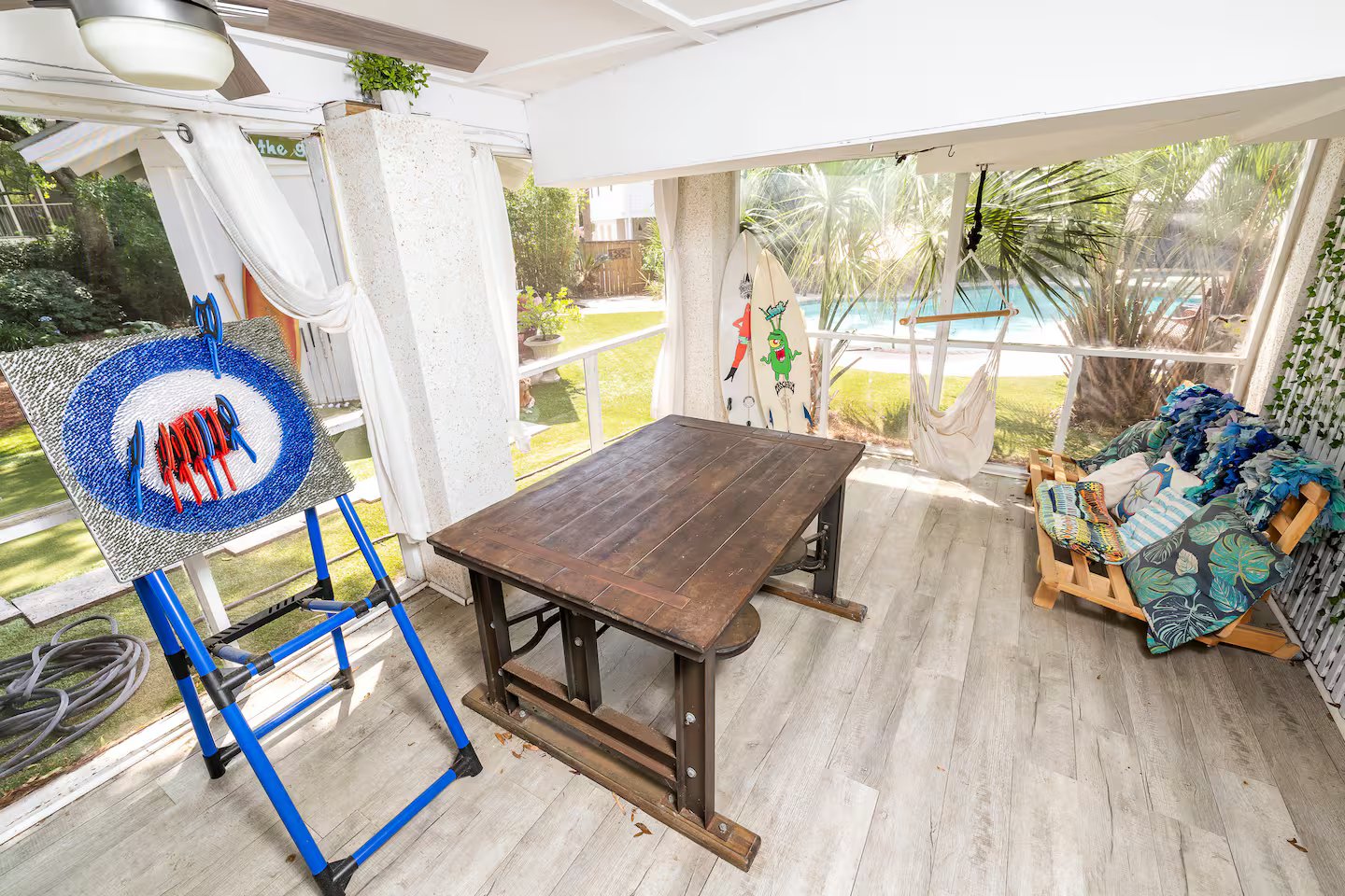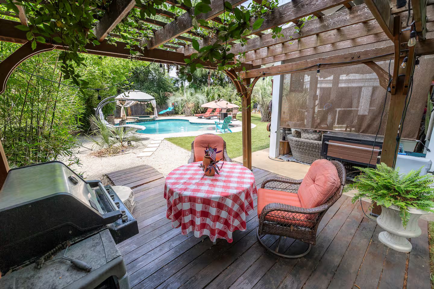 Bring the whole family to this great place with lots of room for fun. Pets are welcome! Large backyard with Putting Green. Cabana & Pool/Spa. 4 Bedrooms with a large open floorplan. Three Bedrooms and Media Room are located on the first level. The Master Bedroom and Ensuite are private and located on the second floor. You won't have to leave the backyard. We have the large pool with a lounging shelf, a spa with an enclosure for privacy are all nestled among the astro-turf lawn.